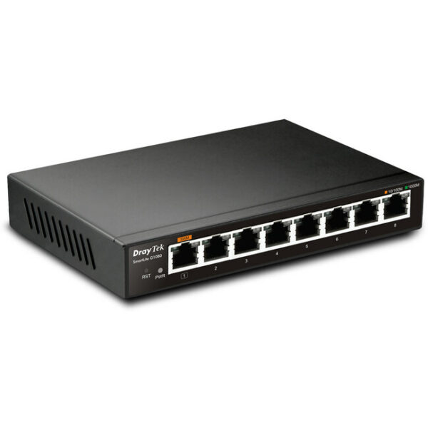The VigorSwitch G1080 is a small, high-performance Gigabit smart switch designed for small and medium business networks that require simple network management, with support for VLANs, QoS and Link Aggregation (increases uplink speed for high data volume applications).