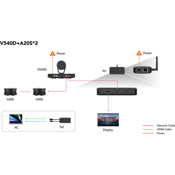 The Nearity bundle-L has been designed to suit large-sized meeting rooms and consists of the following products: – V540D – 2 x A20S – Nearhub Tail – Nearhub Air